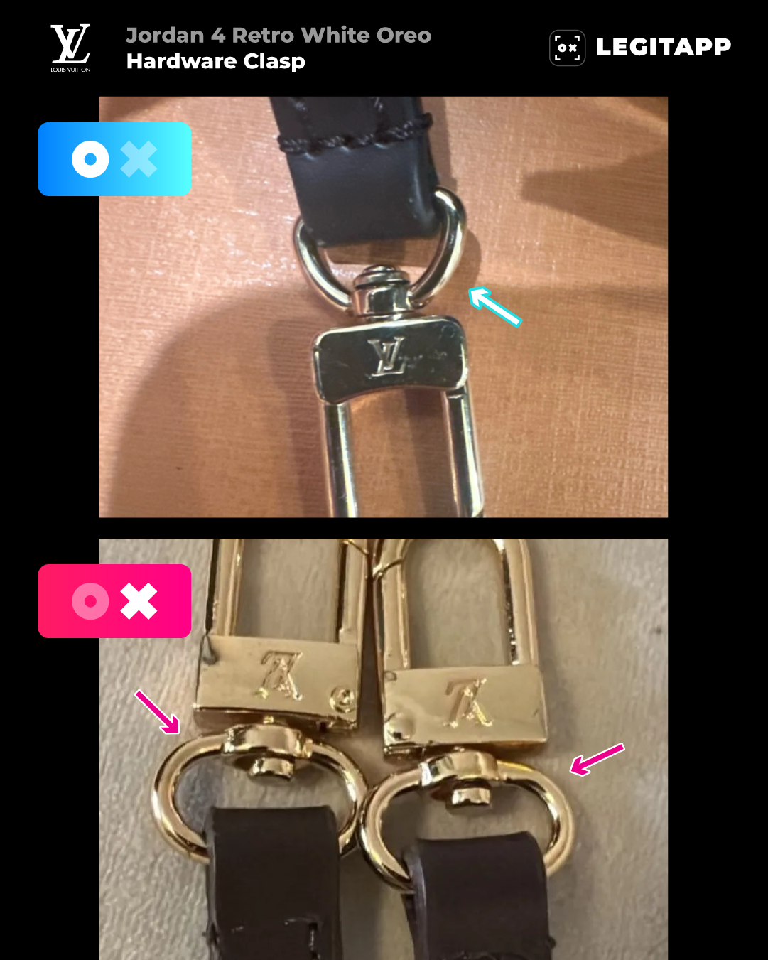 • The D-Ring: Pay close attention to the metal loop connecting the clasp to the strap. An authentic LV clasp uses a D-shaped ring (D-ring). While this replica use an oval-shaped ring.