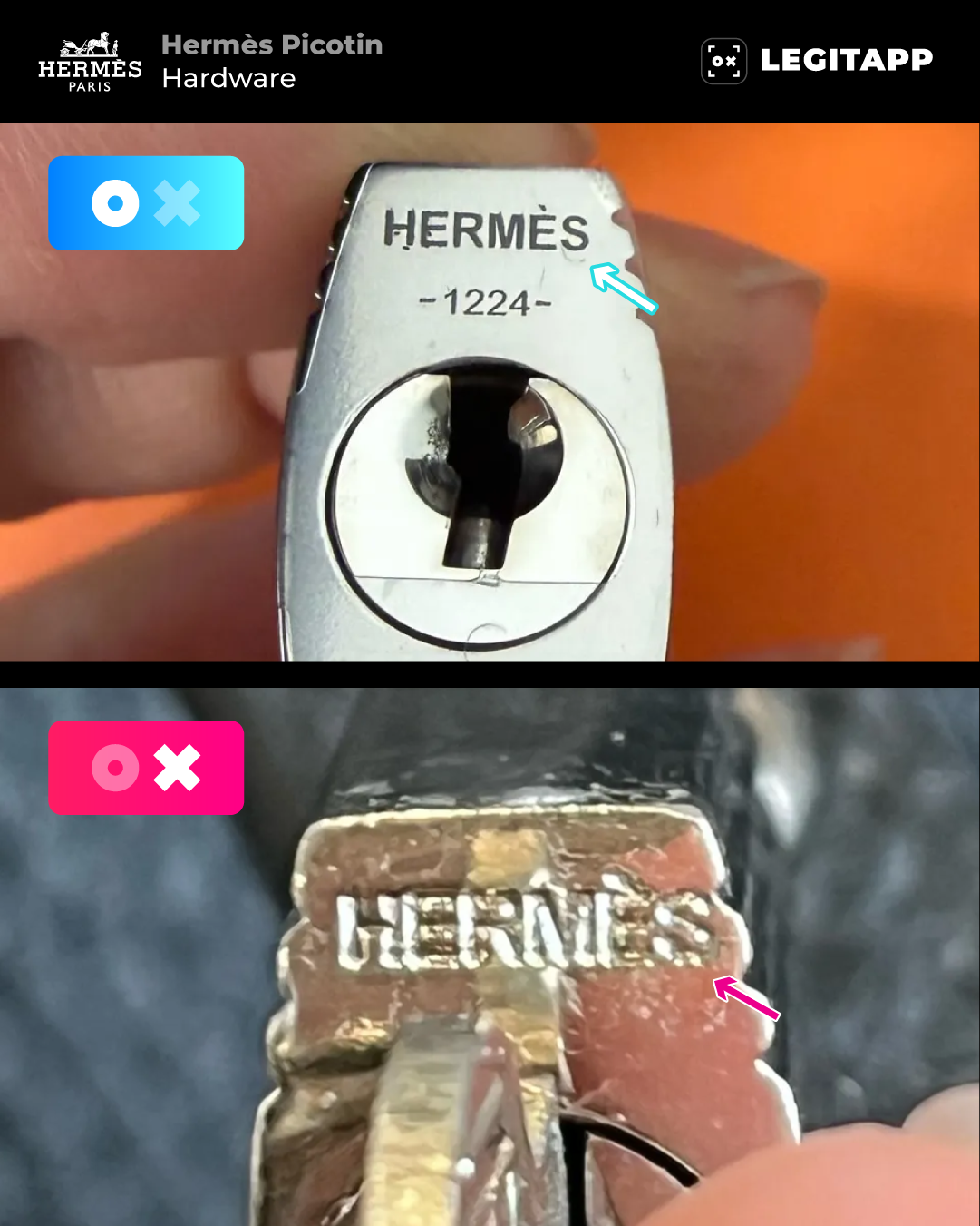 The padlock and keys accompanying a Picotin are central to the authentication process, specifically the "HERMÈS" logo engraved on the lock itself. This area provides a very direct comparison of craftsmanship.