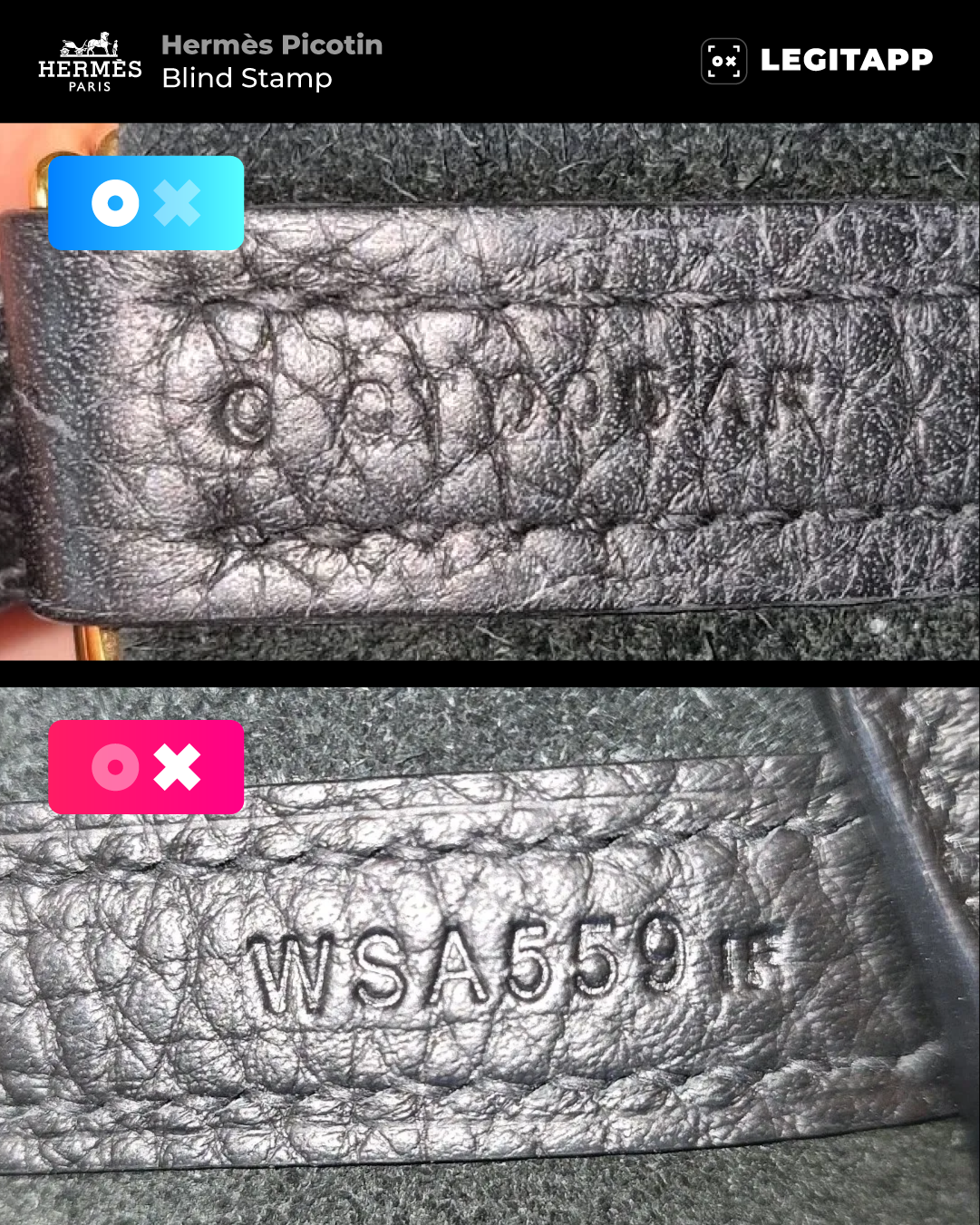 Unlike the visible logo, the blind stamp isn’t meant for display — it’s a heat-pressed letter or combination of letters and sometimes numbers that corresponds to a production year. If you need to identify a bag’s manufacturing year, you can use the LegitApp Free Hermès Date Code Checker.