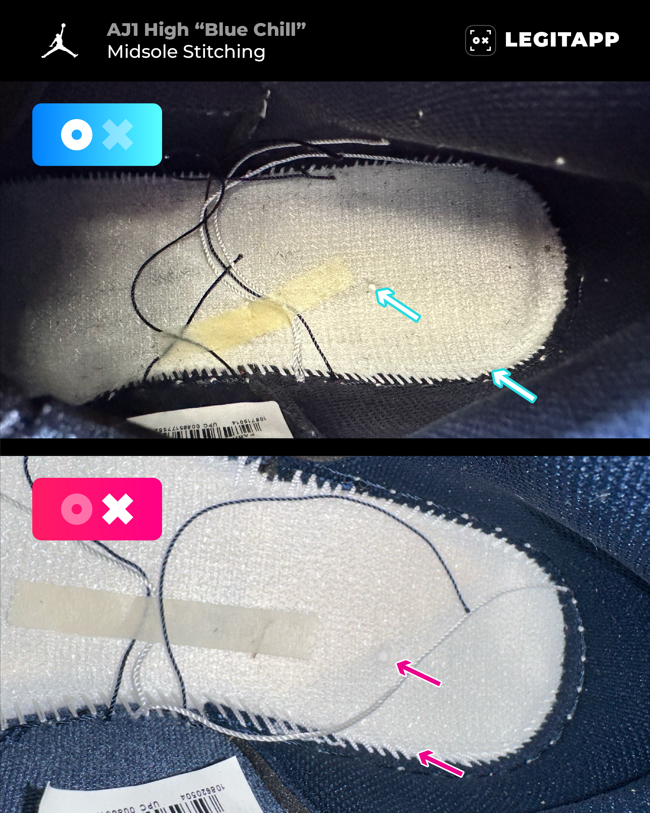 Authentic: The midsole stitching is tidy and consistent, with a smaller positioning hole.