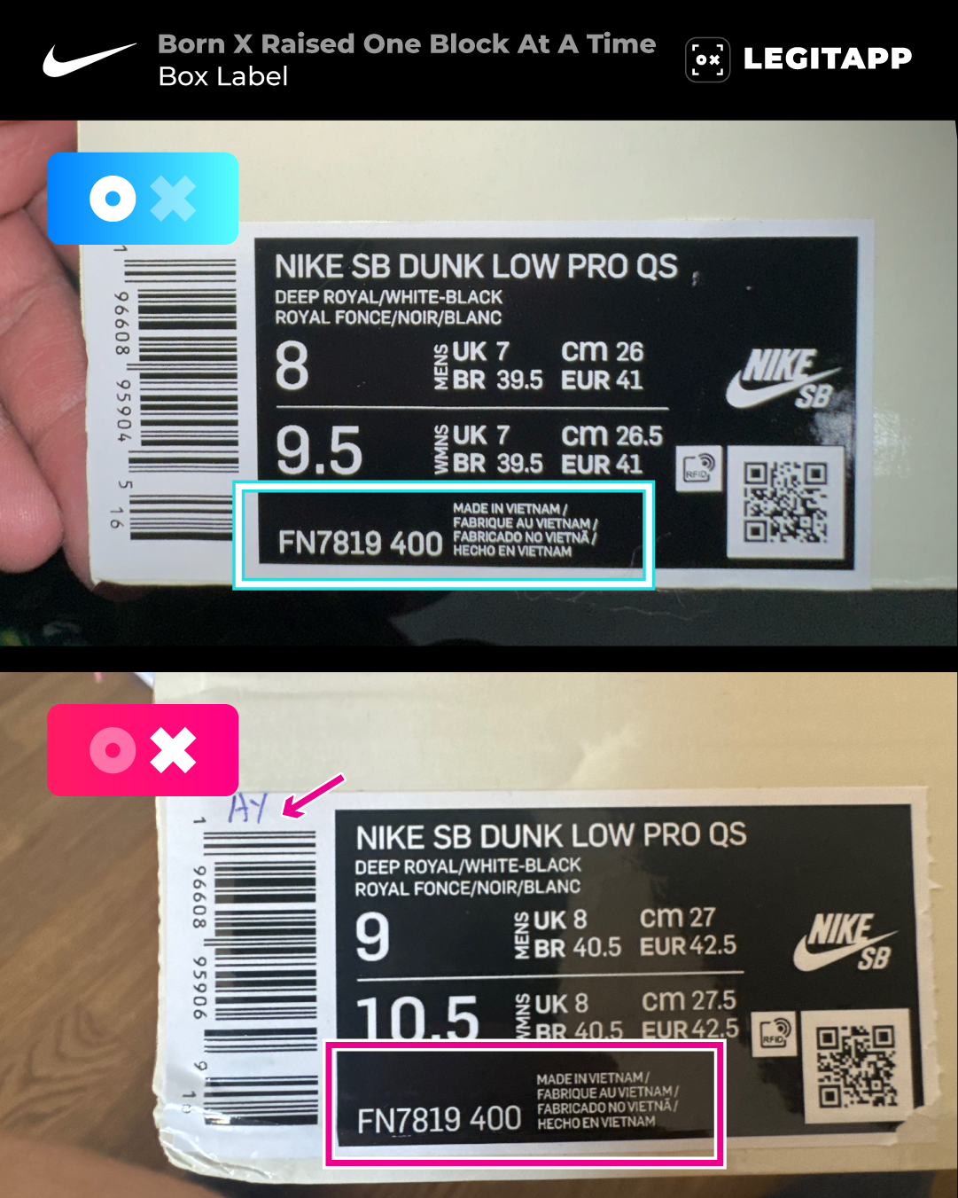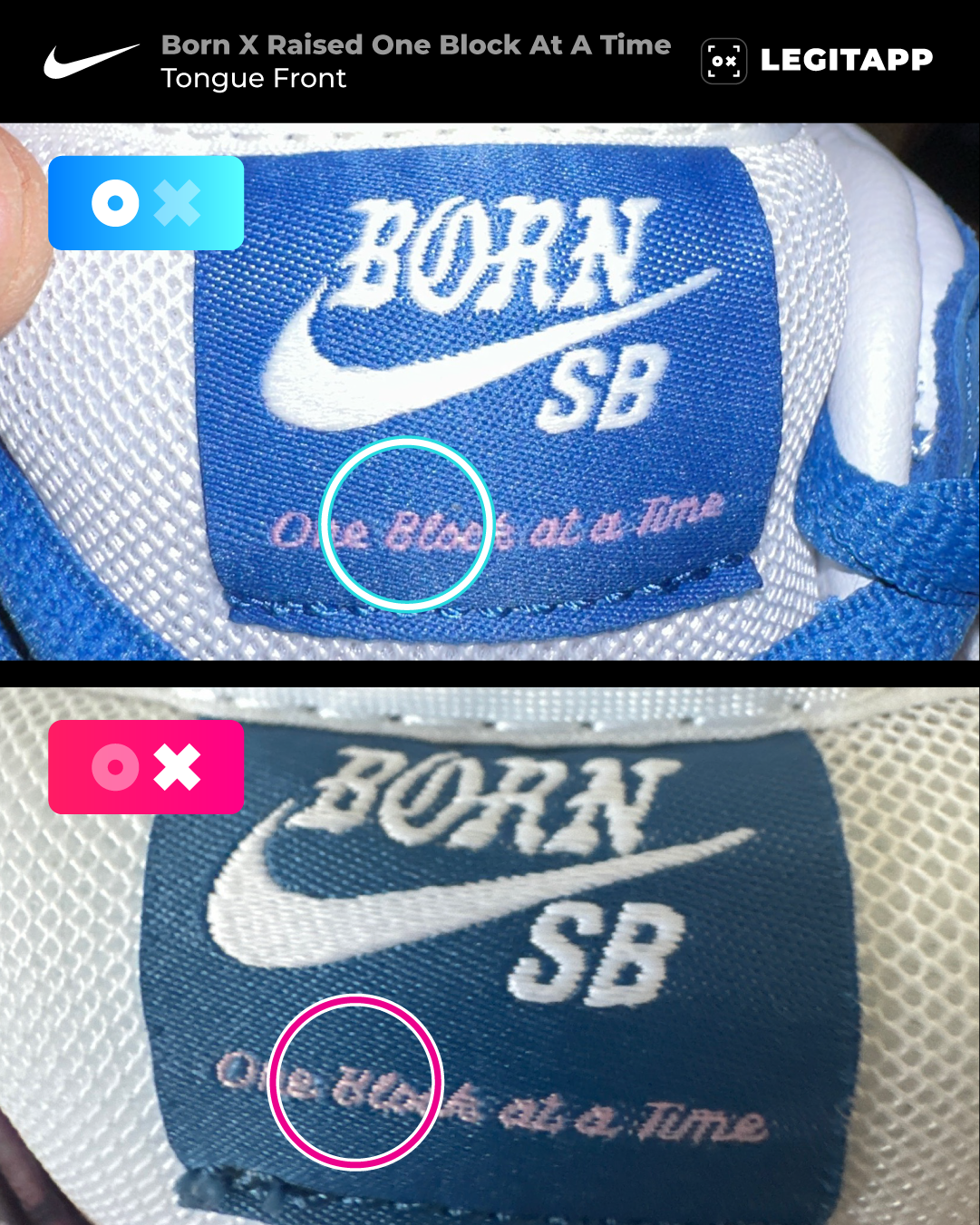 The Born x Raised x Nike SB Dunk Low One Block at a Time was released in 2023 as a collaboration between Los Angeles streetwear brand Born x Raised and Nike SB. Featuring a deep blue upper, unique typography details, and community-inspired storytelling, this pair quickly gained attention in the skate and streetwear scene. Due to its limited nature and cultural significance, replicas have also appeared on the market. Below are some differences to help you identify authentic pairs.