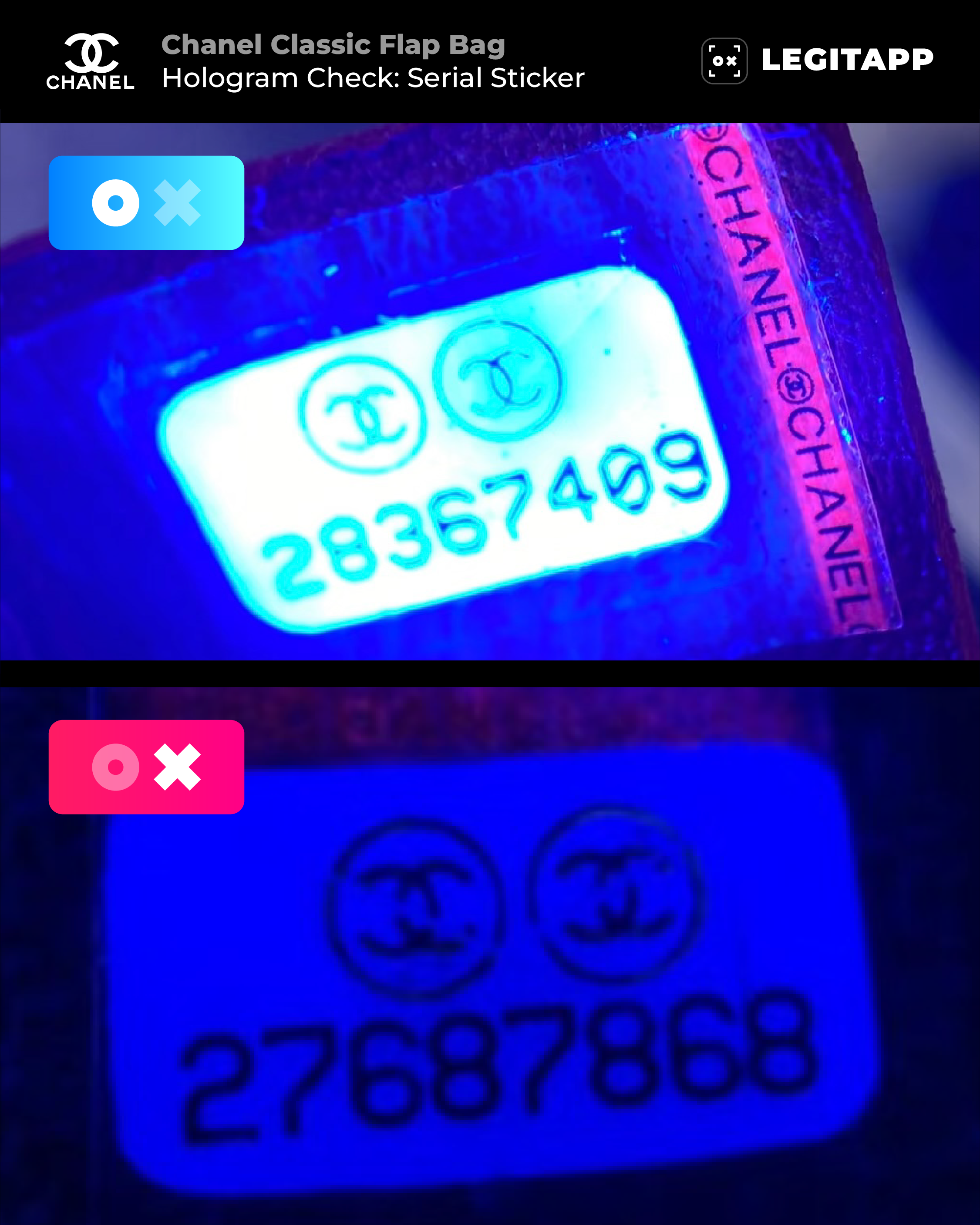 Authentic: When you shine a UV light on the serial sticker, you’ll see a red-glowing Chanel logo strip running across it — this is a key authenticity feature.