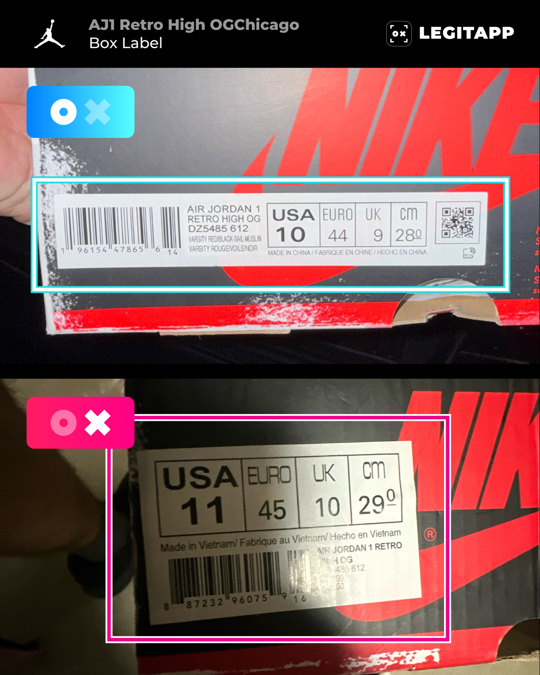 If you still want extra confirmation, LegitApp can help you verify your AJ1 Lost and Found pair with ease. Just upload clear photos of the key areas — heel, tongue, insoles, size tag, midsole, and box label — and our authenticators supported by AI will review every detail and provide a clear result. This service can give you confidence before buying, selling, or keeping your sneakers.