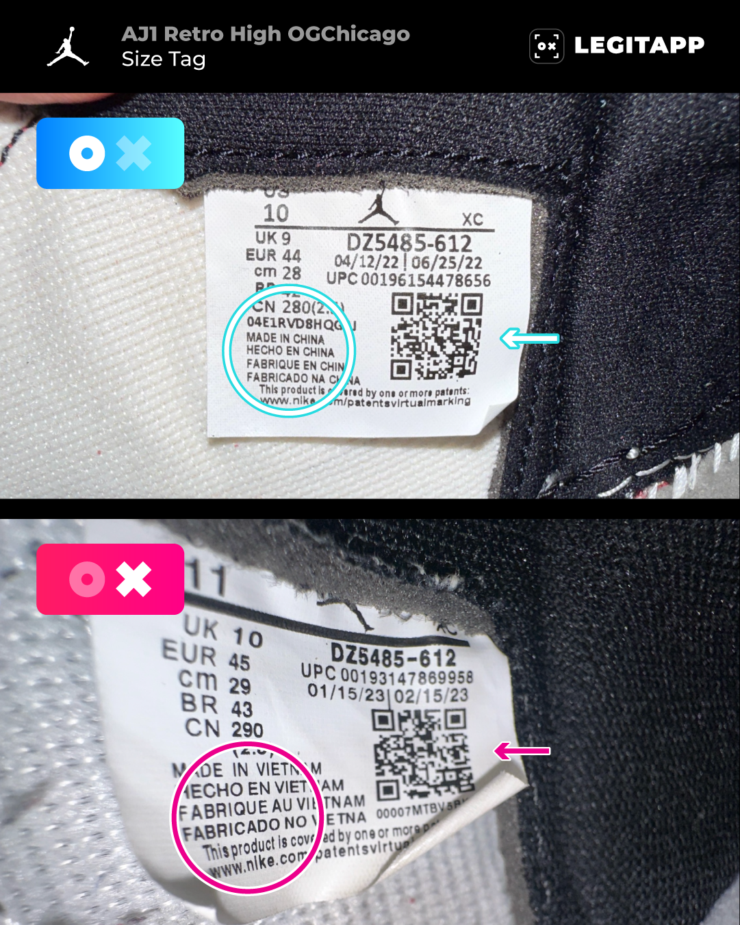 Authentic: The size tag lists Made in China and does not include a random code line under the QR code.
