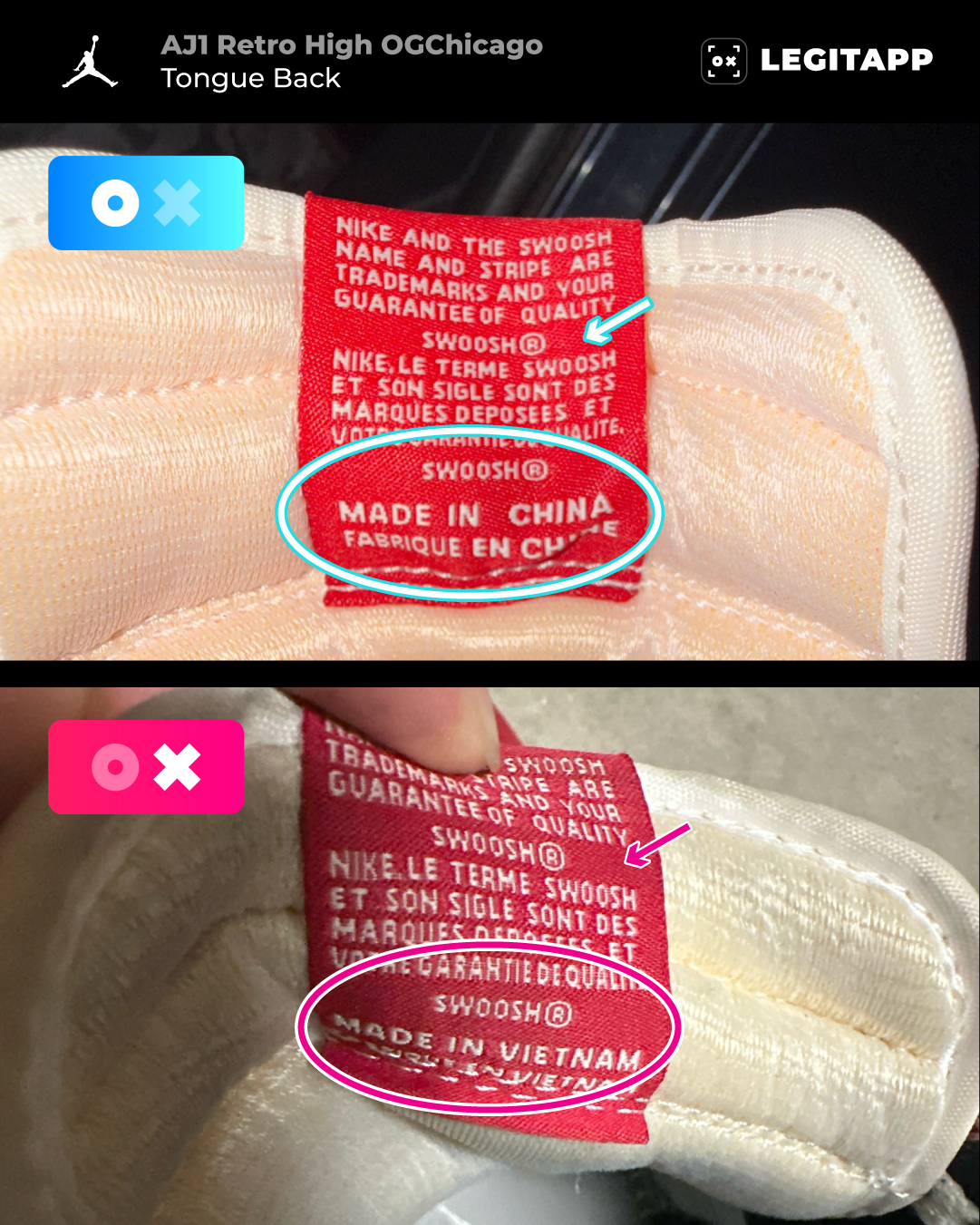 Replica: The back of the tongue shows Made in Vietnam, with thinner letters spaced further apart.