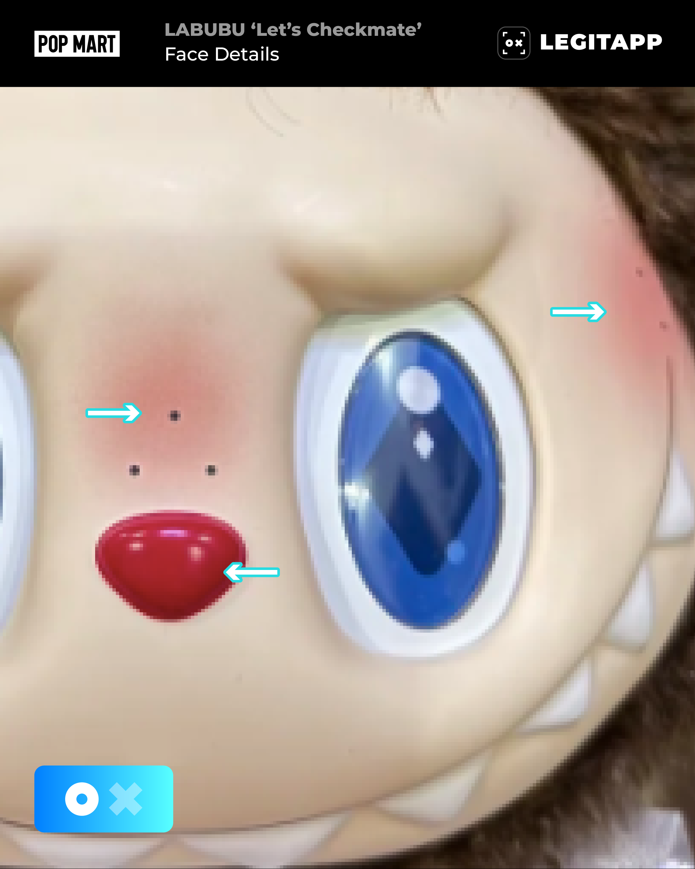 Observe the blush placement and color. Authentic LABUBUs show naturally blended cheek color and consistent nose shading, while replicas tend to have misplaced blush spots or the wrong color tone.