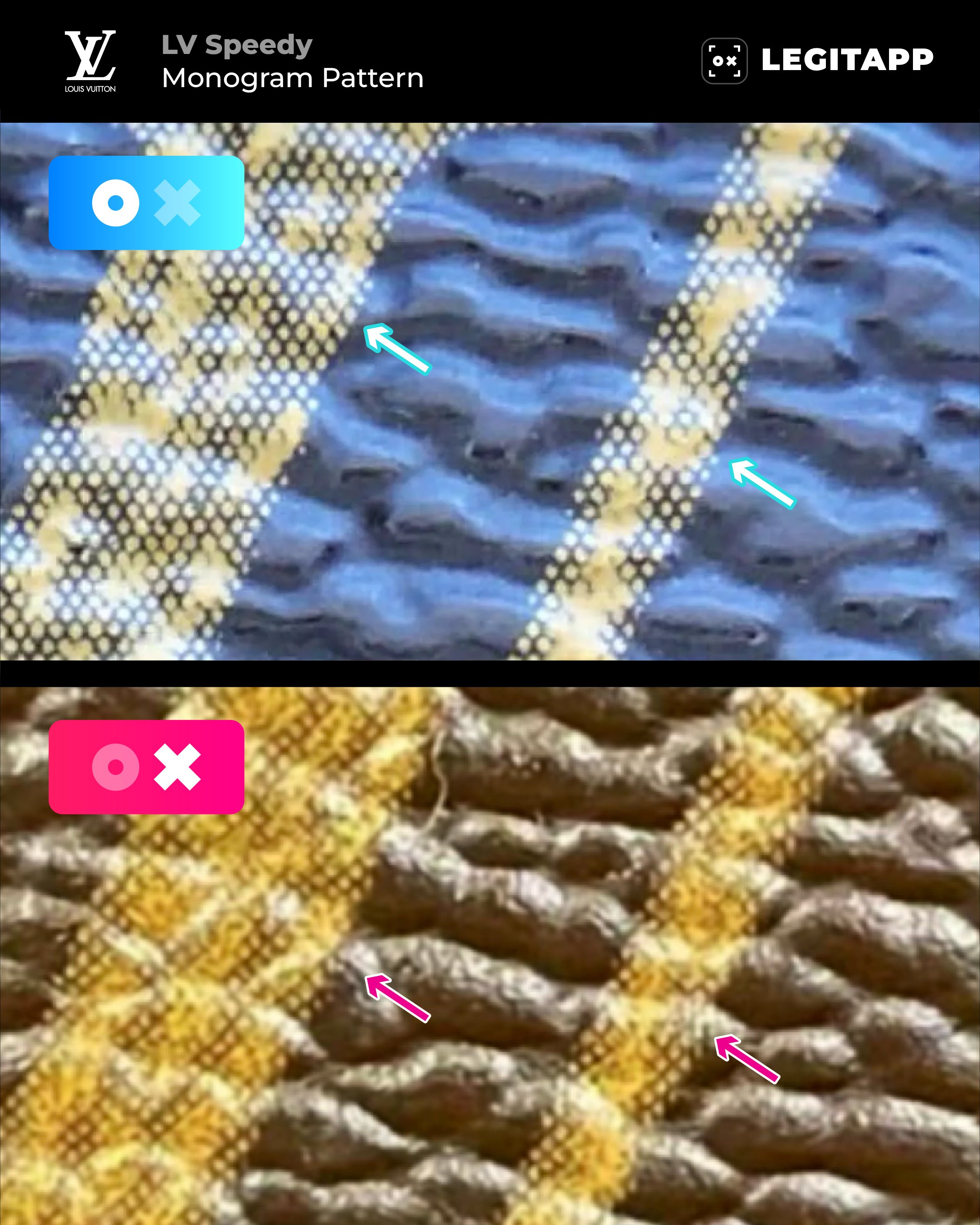 Authentic: The monogram features a stair-step alignment along the edges — a signature LV detail. The “LV” prints appear clean and structured with clearly stepped edges