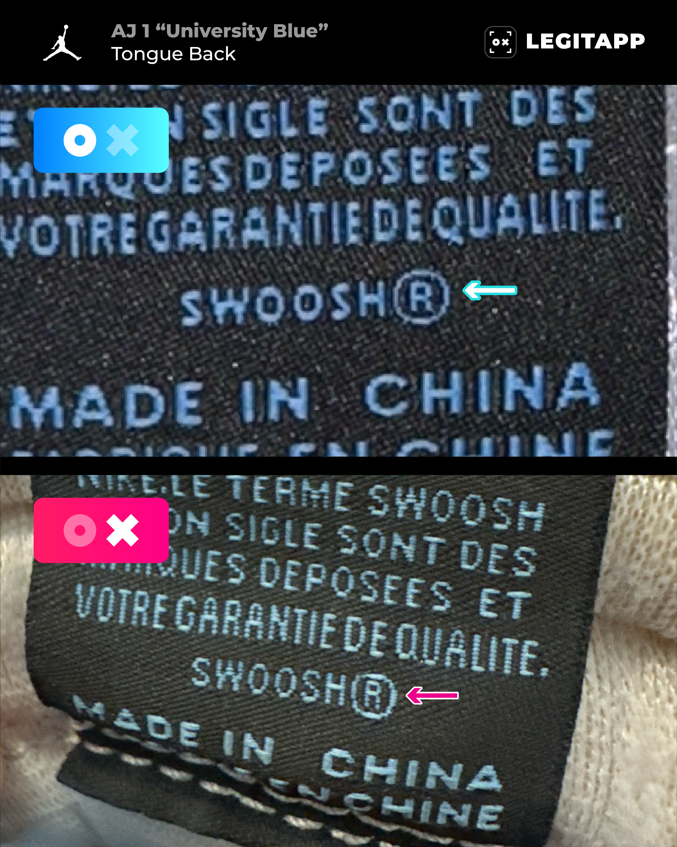 Authentic: The embroidered ® mark on the back of the tongue has an even thickness around the outer circle.