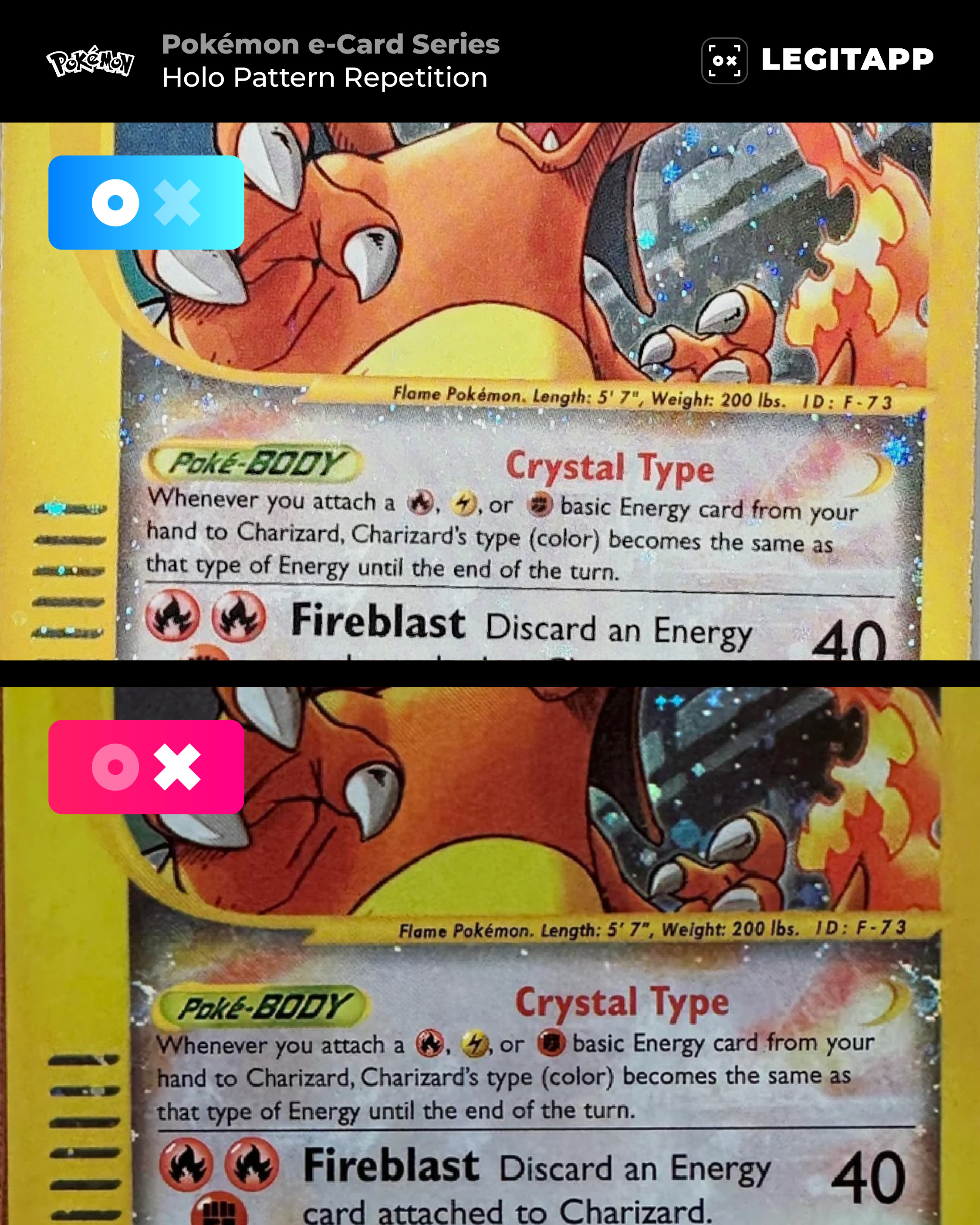 Replica: Printing looks blurry, energy symbols shift to the right, and rainbow-like holo effects may appear.